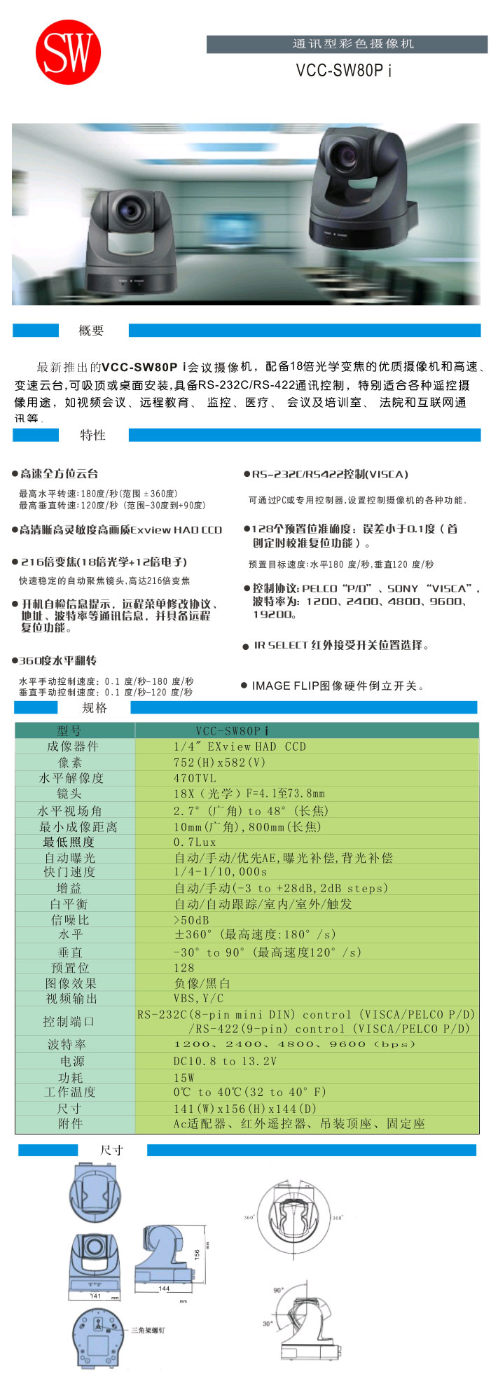 華精電 VCC-SW80Pi 一體化攝像機技術(shù)參數(shù)